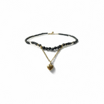 This necklace features a strand of matte black gemstone beads paired with a delicate gold chain and a small gold heart pendant. It rests elegantly in a green presentation box. The design evokes bohemian elegance, ideal for casual or layered jewelry looks.